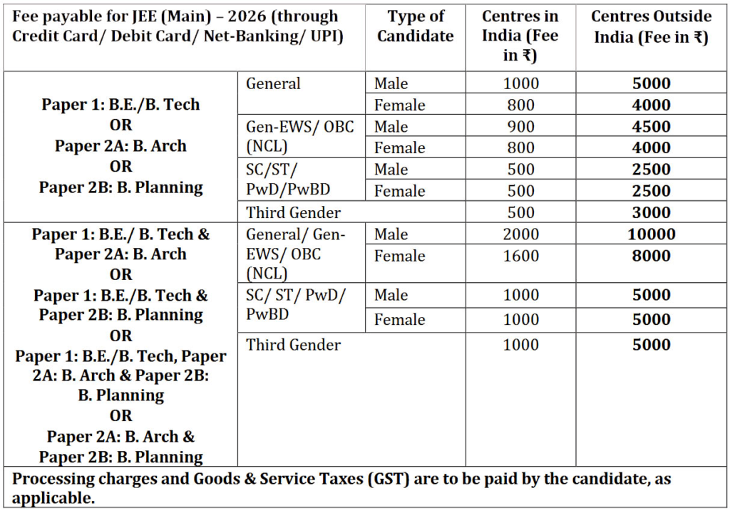 Age LimitThere is no age limit to appear in JEE Main 2026. Candidates who have passed Class 12/equivalent in 2024, 2025, or are appearing in 2026 can apply. However, candidates must meet the age criteria of the respective institutes they wish to join. Educational Qualification:Only candidates who: Passed Class 12/equivalent in 2024 or 2025, or Are appearing in Class 12/equivalent in 2026, are eligible to appear for JEE Main 2026. Candidates who passed Class 12/equivalent before 2023 are not eligible. State of Eligibility:The state code of eligibility refers to the state from where the candidate passed Class 12, not the native state or place of residence. For example, if a candidate studied in New Delhi but resides in Noida (U.P.), their state code of eligibility will be Delhi. Application Fee of JEE Main 2026How to Apply JEE Main 2026 ?